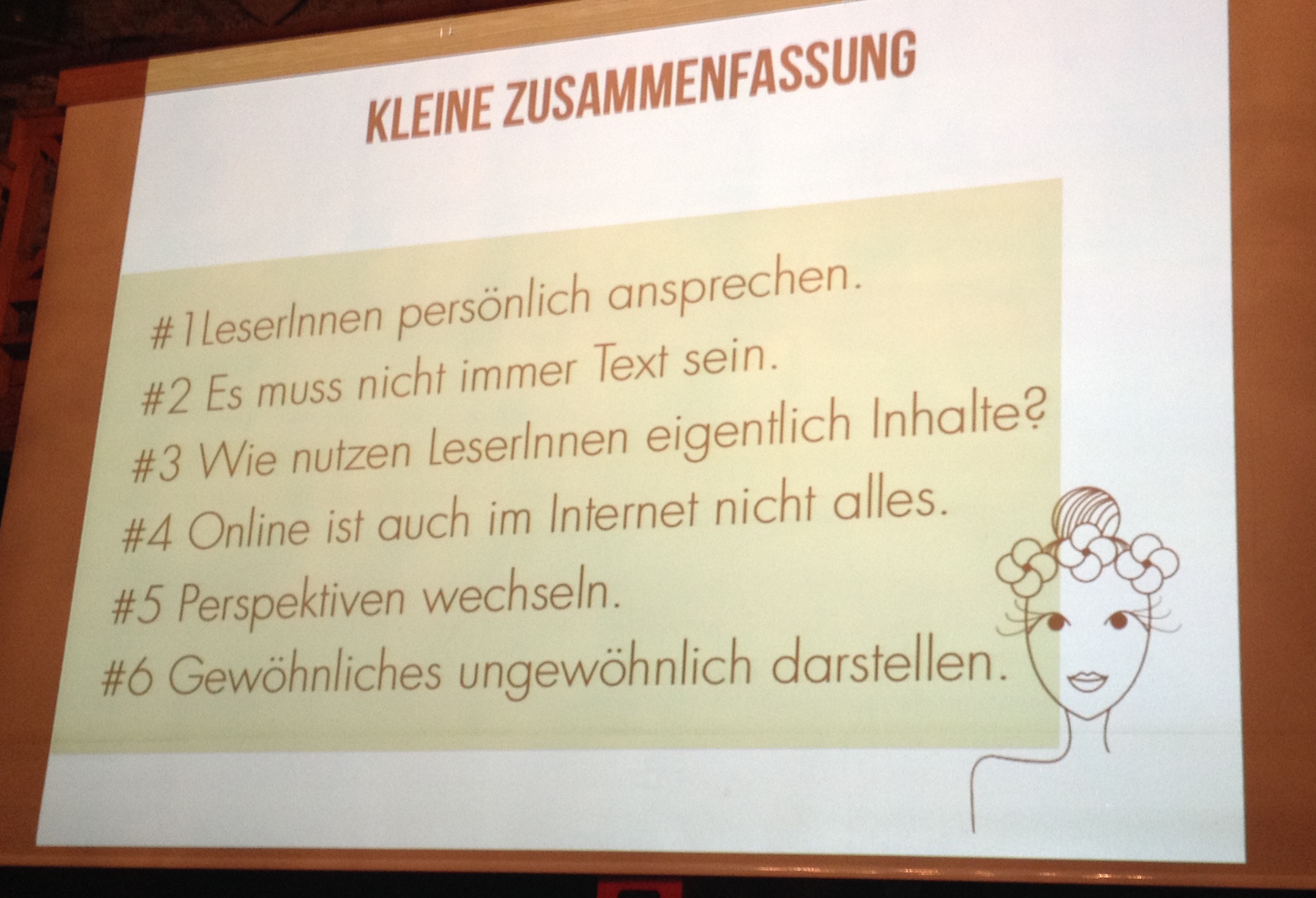 Dabei haben Sie uns 6 Tipps gegeben, wie man aus einem schlappen Blogpost einen echten Blogbuster machen kann. Die Session hat mir wieder neue Impulse gegeben, wie man den eigenen Blog besser gestalten kann. Hier die wichtigsten Regeln: